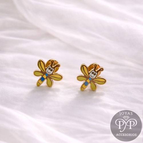Tiernos aretes con diseño de libélula, elaborados en acero inoxidable con acabado dorado y detalles esmaltados de colores. Su estilo alegre y delicado los convierte en el accesorio perfecto para añadir un toque divertido y especial a cualquier look.